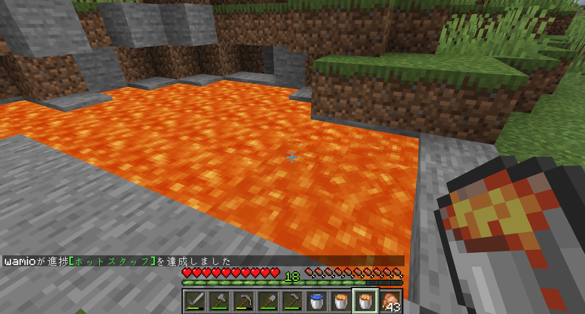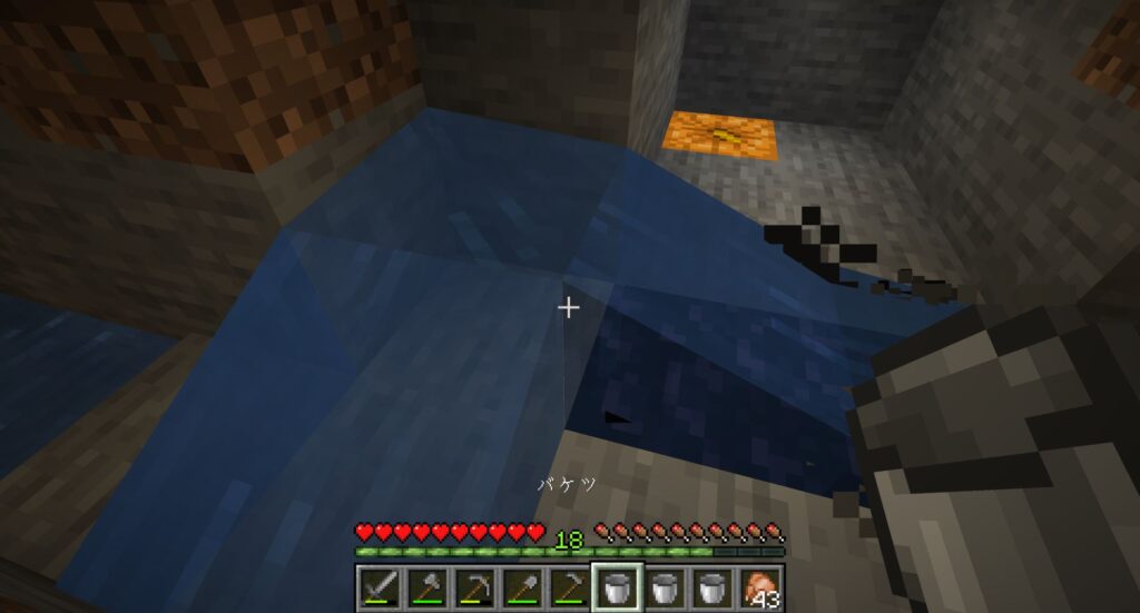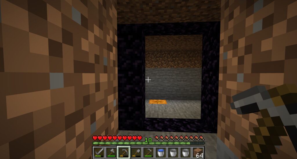 ネザーに移動するための「ネザーゲート」を作るには、黒曜石10コと「火打石と打ち金」が必要だ。「火打石と打ち金」の材料は既にある。黒曜石はマグマに水をかけることで入手できる。黒曜石にしてしまうとダイヤモンドのツルハシがないと発掘できないが、マグマのままならバケツで運搬できる。