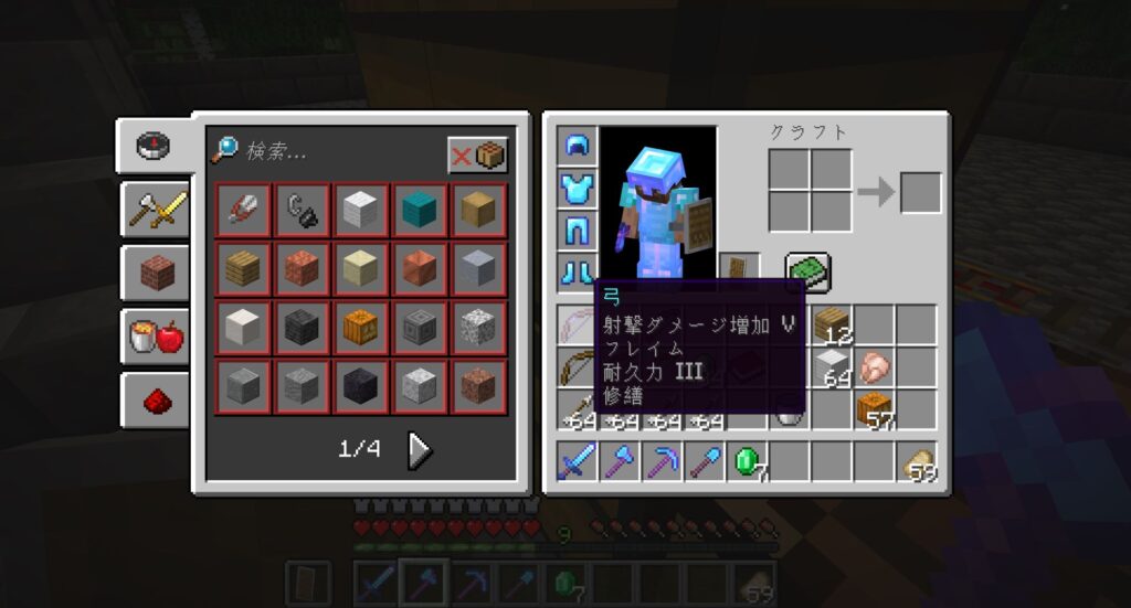 矢は無限エンチャントがあれば不要だから、村人ガチャしたら手に入るか。