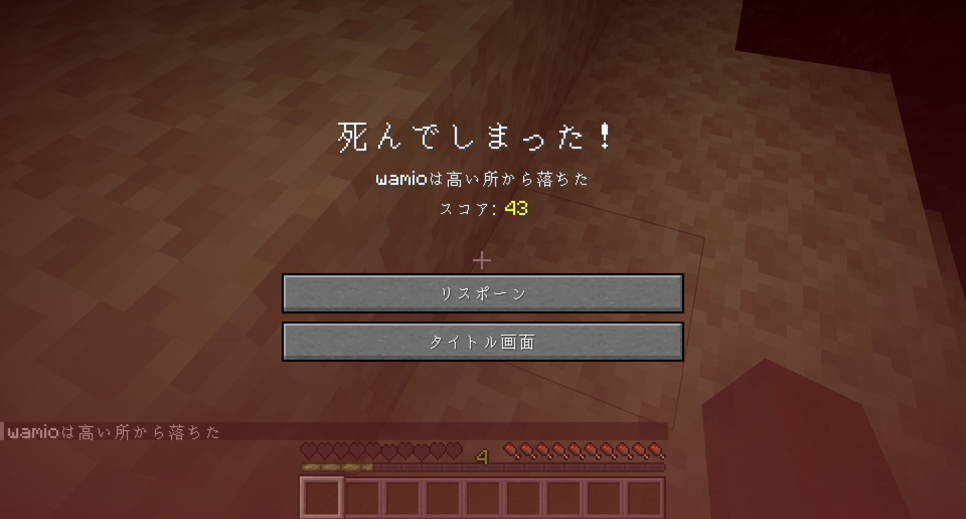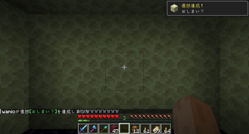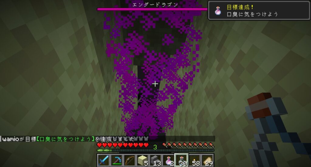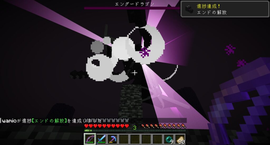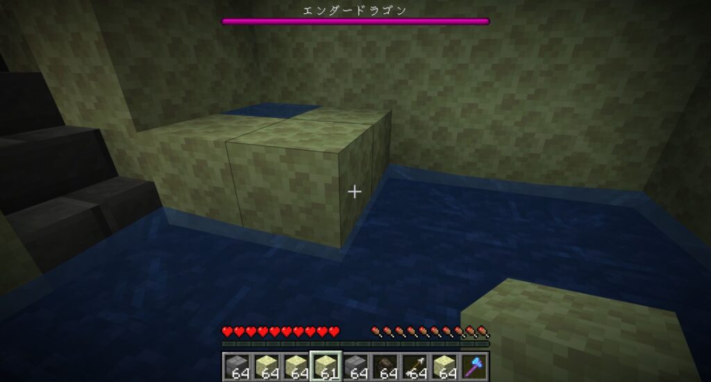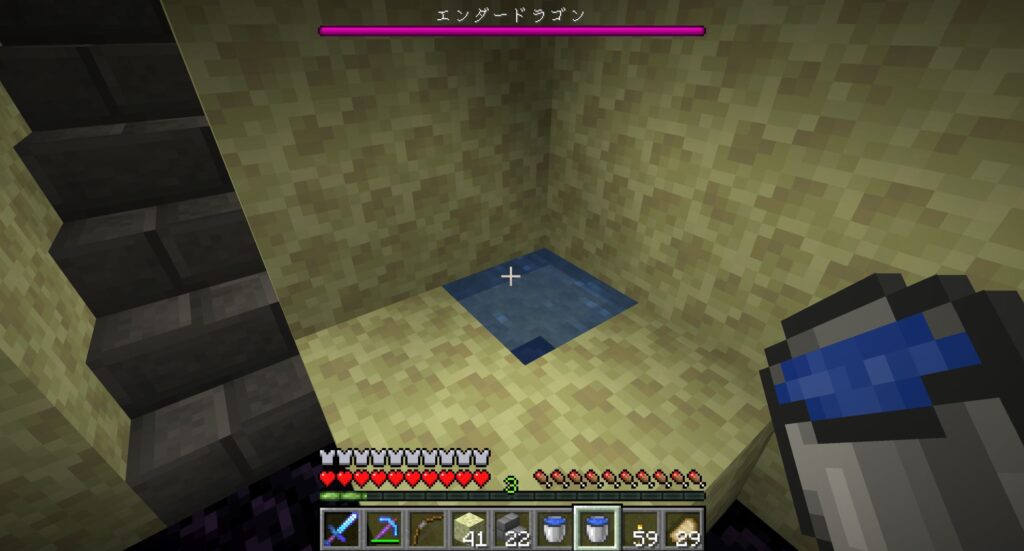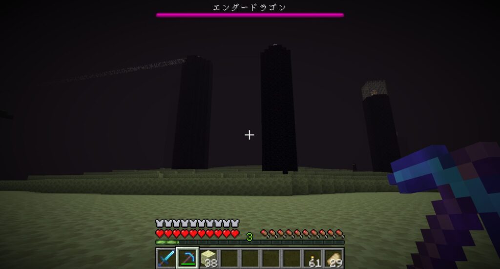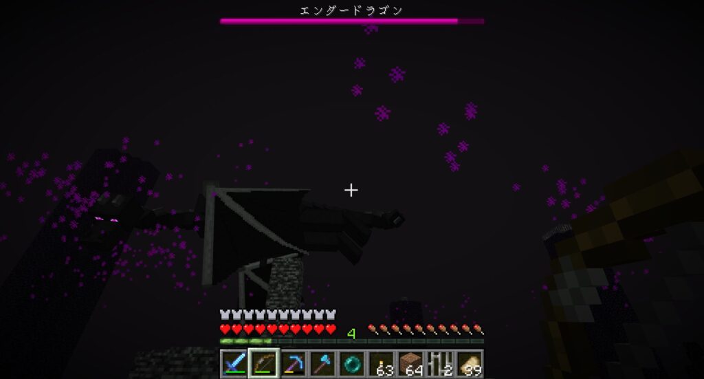 そのあと、気長に何回も死にながらエンダードラゴンを攻撃し続けたら、いずれエンダードラゴンは死ぬ。