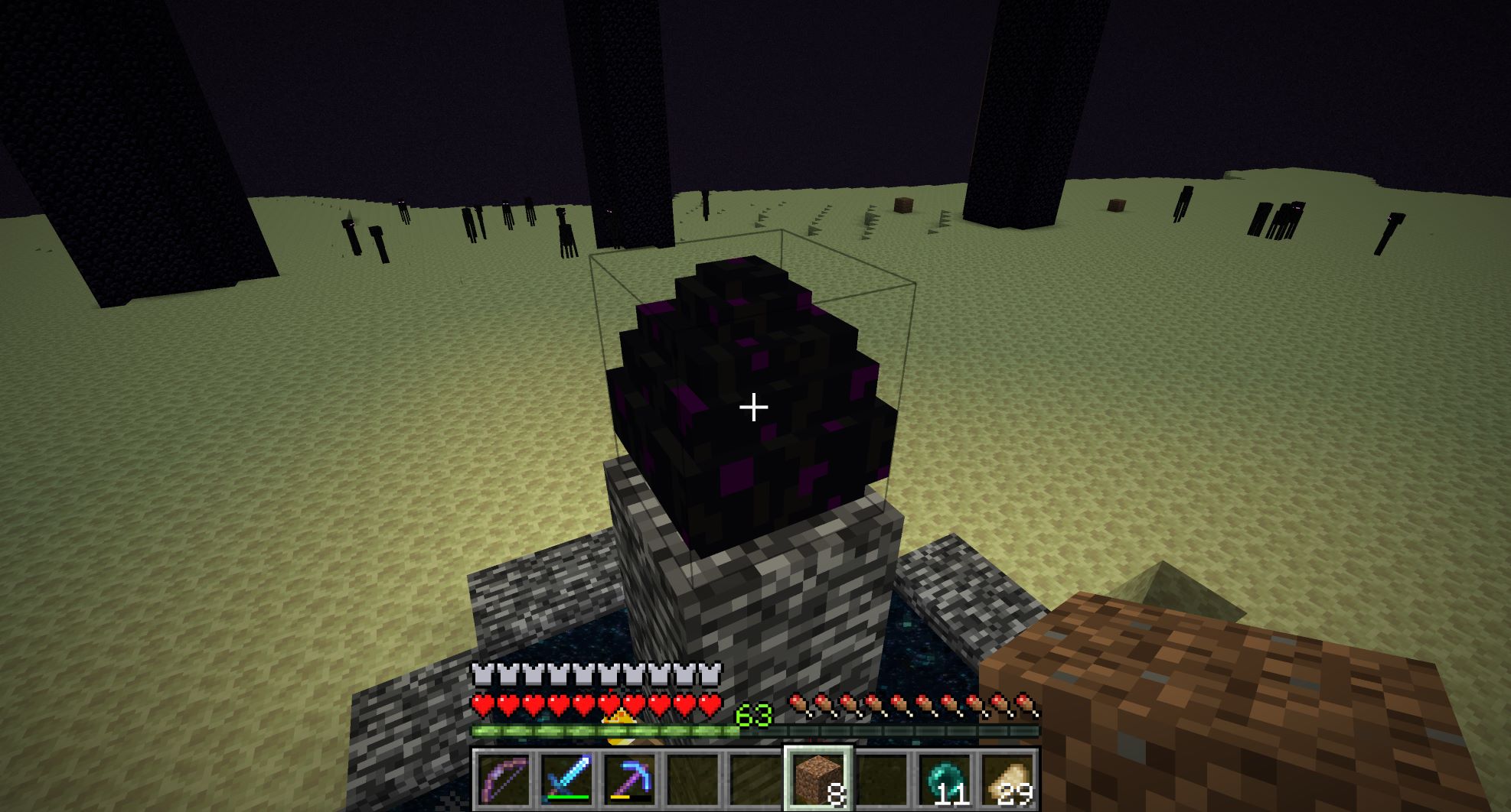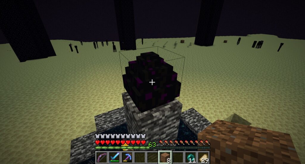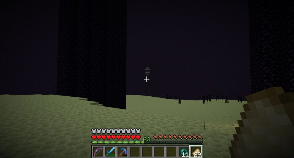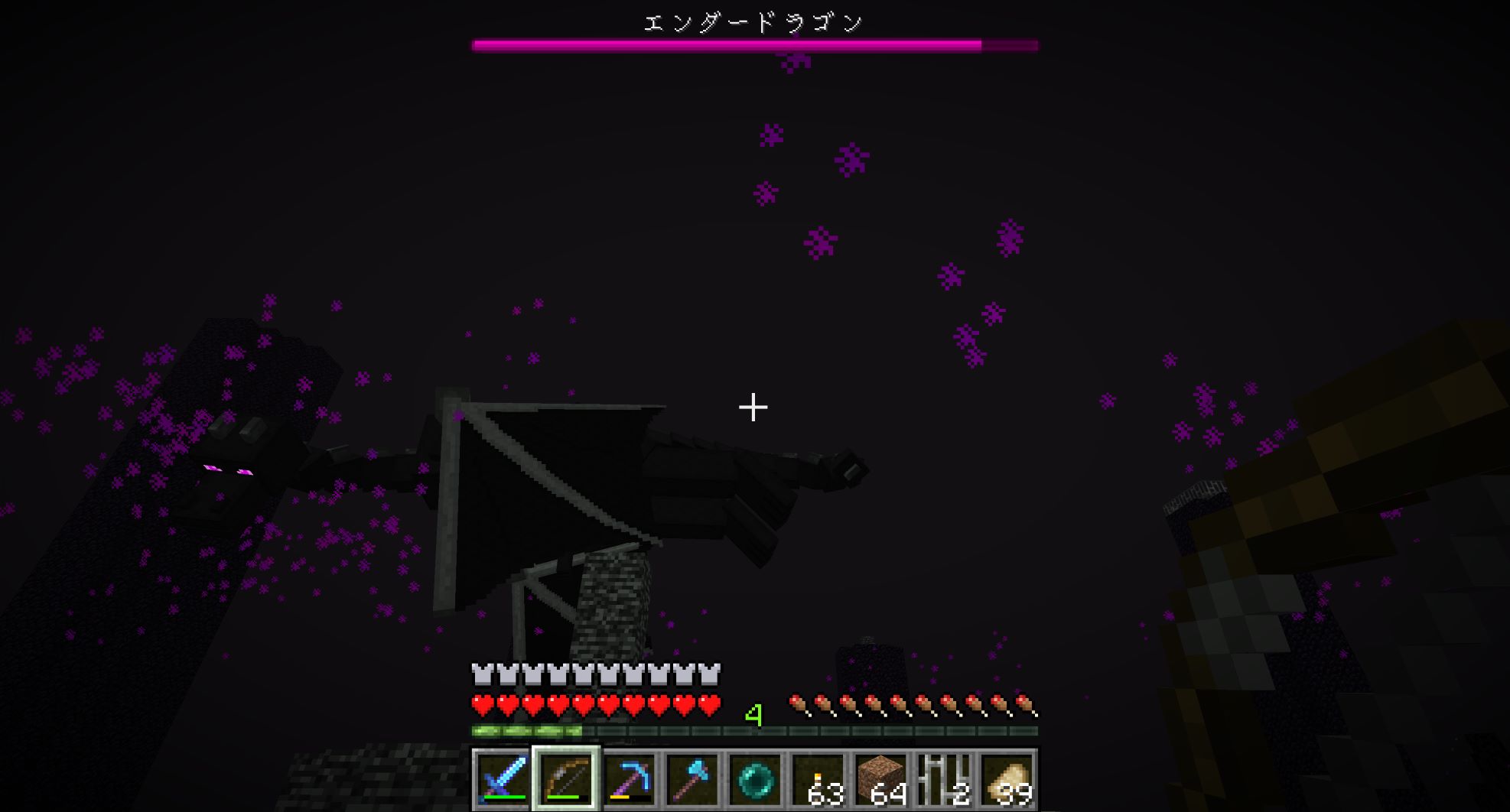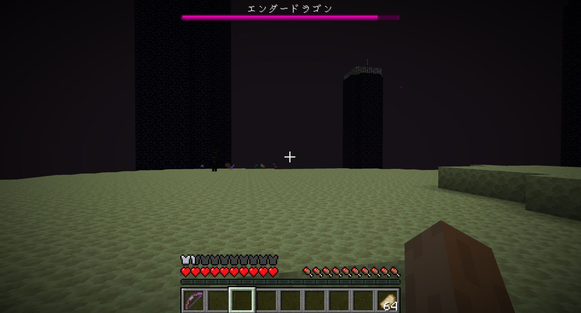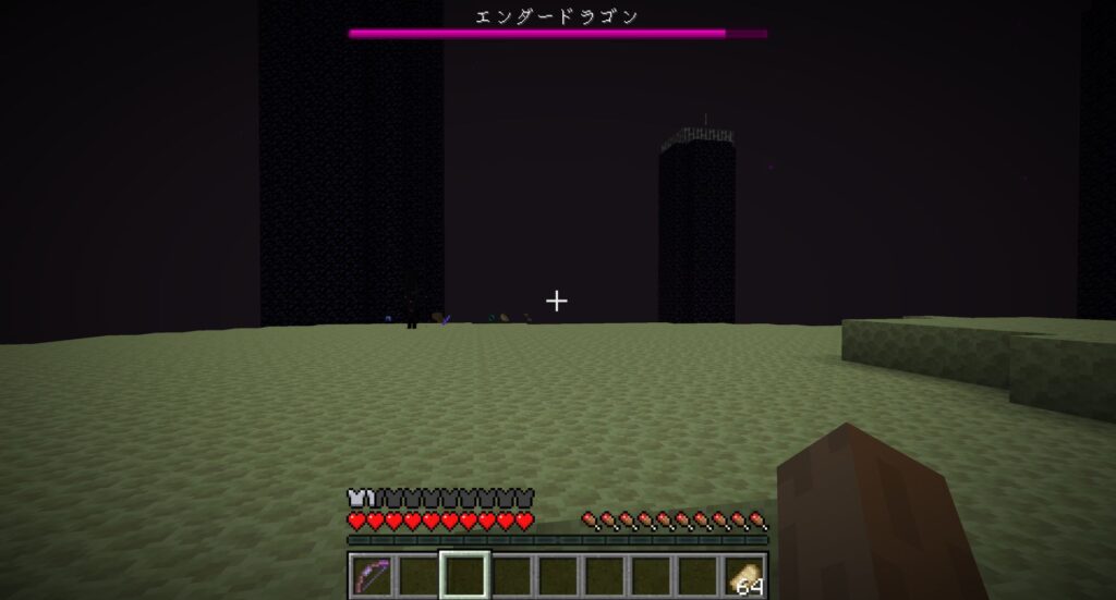 前にやったときは、スノーゴーレム(超弱い)を召喚して味方にしたら、エンダードラゴンの攻撃の流れ弾がエンダーマンに当たってエンダードラゴンとエンダーマンの戦闘が始まって、勝手にエンダードラゴンのHPが下がっていく現象が起きたが、再現できるかどうかわかんないし、スノーゴーレムを召喚してるときに攻撃されて多量に召喚するのも結構面倒なので射撃で戦うことにする。